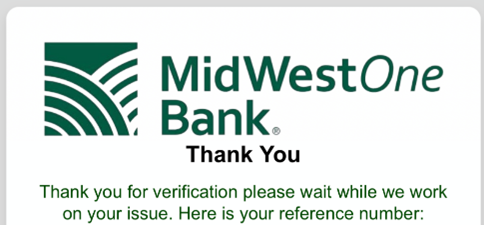 If you suspect fraud, or you feel unsure about the conversation, please hang up and call your banker or MidWestOne Bank’s service center phone number, which is 800-247-4418 (this number can also be confirmed on the MidWestOne Bank website). This action will terminate the fraudsters’ attempt to spoof MidWestOne Bank.