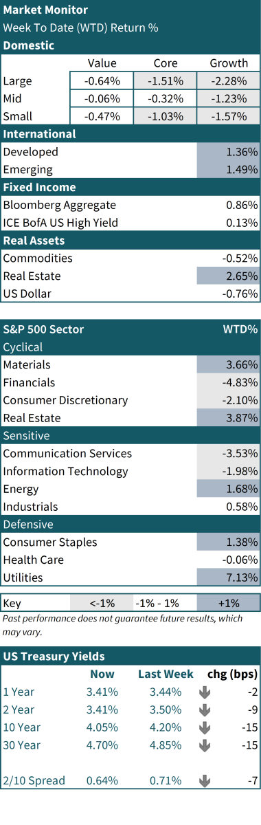 Leadership continued to rotate away from mega‑cap growth toward defensives and rate‑sensitive sectors. Value topped Growth and Small Caps outperformed Large Caps. Utilities, Materials, and Real Estate led among sectors, while Financials and Communication Services lagged. Overseas, Developed Markets—led by Japan—outpaced Emerging Markets, where China remained a drag. Tone throughout the week leaned cautious rather than risk‑off on the whole, with volatility higher, the USD lower, and oil weaker.